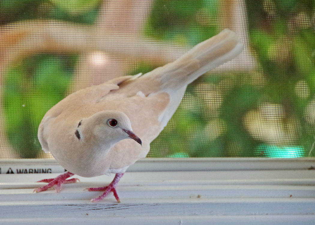 On the way out of the store, I noticed a white and camel colored dove sitting on the grassy median next to our car. It was in sorry shape. The dove had only two tail feathers. It was also missing a strip of feathers down the top of its head to the base of its neck. It looked like a reverse mohawk. This poor bird must have had quite the misadventure.